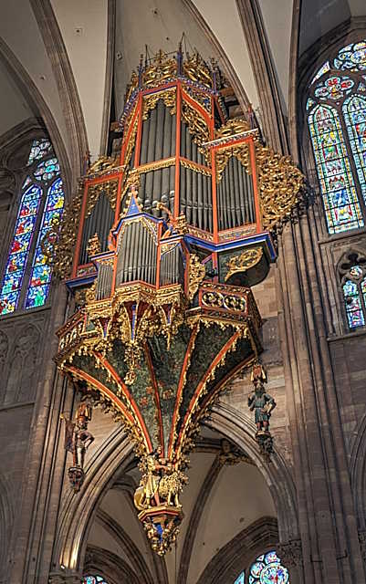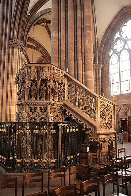 La chaire de la Cathédrale Noie-Dame est de style gothique flamboyant, poussé à l’extrême. Placée contre la 3ème pile orientale de la nef, elle est de plan hexagonal et s'élève sur 2 étages. 56 statuettes la décorent, abordant de nombreux thèmes tels que les évangélistes, un cortège de 8 figures d’apôtres, la crucifixion de Jésus-Christ entouré de sa mère Marie et de l’apôtre Jean ou encore sainte Barbe, saint Laurent et les anges portant les instruments de la Passion. La chaire a été réalisée, entre 1485 et 1487, pour le prédicateur moraliste Jean Geiler de Kaysersberg, par le sculpteur et maître d’œuvre Hans Hammer. Elle porte la date de 1485. Son œuvreest signé par le monogramme « H » qui se retrouve sur la rampe et sur la clef, sous la corbeille. Les statuettes remontent au XVIIIe siècle, d'autres au XIXe siècle, remplaçant certaines qui furent subtilisées.