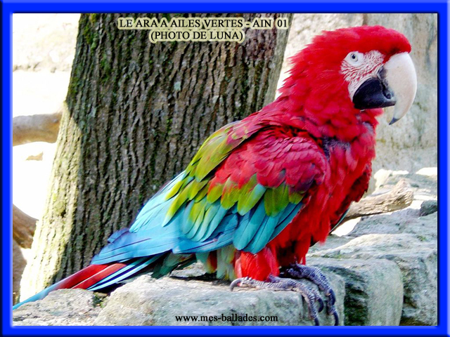 Vous découvrirez aussi au Parc des Oiseaux à Villars-les-Dombes, dans le département de l'Ain, l'Ara à ailes vertes, en région Auvergne-Rhône-Alpes, en France.