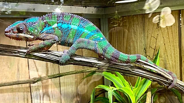 Cet étrange animal, de toutes ls couleurs est un Caméléon. Il adapte les couleurs de son corps à son environnement.