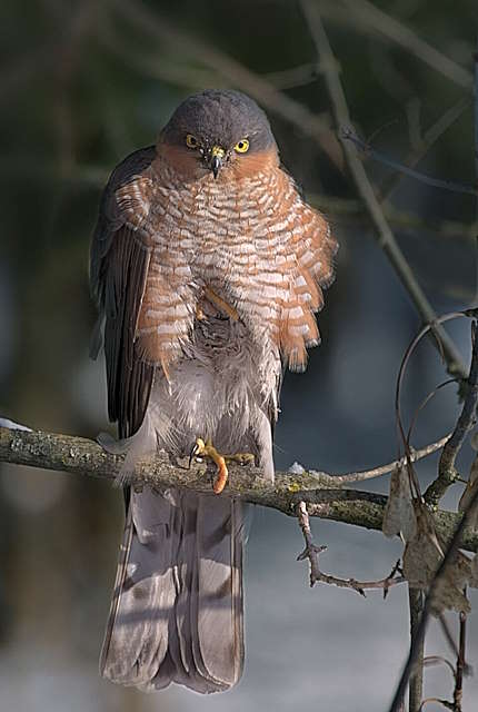 L'Epervier d'Europe fait partie de la Faune qui vit dans le Jura, en région Bourgogne-Franche-Comté, en France. L'Epervier d'Europe est aussi appelé Accipiter nisus, est un petit rapace. C'est un petit oiseau de proie, de la Famille des Accipitridae. Ce petit rapace possède de larges ailes arrondies, plutôt courtes et une longue queue, qui l'aident à se déplacer, parmi les arbres. La queue est toujours plus longue que les ailes ne sont larges. Elle est striée de 4 ou 5 barres, vagues chez le mâle adulte. Les pattes jaunes sont longues et le tarse n'est pas plus large que le diamètre de l'œil. Les femelles peuvent être jusqu'à 25 % plus grandes que les mâles, et peser jusqu'à 2 fois plus que le mâle. Le mâle adulte mesure de 27 cm à 34 cm de long, avec des ailes d'une envergure de 59 cm à 64 cm et une masse de 110 à 196 g. Il a les parties supérieures gris ardoise (tendant parfois vers le bleuâtre), avec le dessous finement barré de roux, qui peut sembler entièrement orange de loin. Ses iris sont orange-jaune ou rouge-orangé. La femelle est beaucoup plus grande avec 35 cm à 41 cm de longueur. L'envergure des ailes est de 67 cm à 80 cm et une masse de 185 g à 342 g. Ses parties supérieuressont de ton brun foncé ou gris-brun et les parties inférieures barrées de gris-brunâtre. Ses iris sont jaune vif à orange, surmontés d'un sourcil pâle. En chasse, il vole au ras des arbres ou des buissons pour surprendre les passereaux. Son vol caractéristique, onduleux, alterne des battements d'ailes rapides et de courts vols planés en arc de cercle. C'est un oiseau généralement discret et silencieux en période d'hivernage. Lors de la période de reproduction, il « glapit » ou « tiraille ». Il émet, principalement, un caquètement constitué d'une série de syllabes simples comme kyukyukyukyukyu ou kikikikikikiki. L'Épervier d'Europe est un grand prédateur des petits oiseaux des bois, bien que seules 10 % de ses attaques soient couronnées de succès. Les petits oiseaux sont tués sur le coup ou quand ils sont comprimés dans la patte de l'épervier, en particulier par les deux longues griffes. Les victimes qui luttent sont « pétries » par le rapace, qui utilise ses griffes pour écraser et lacérer. Ses longues pattes lui sont utiles lorsqu'il a affaire à de plus grosses proies qui se débattent et donnent des coups de bec. Il se dresse au-dessus de sa proie, lui arrache les plumes et la met en pièce. La population des Éperviers d'Europe s'effondre, dans la seconde moitié du XXe siècle. Cet effondrement a coïncidé avec l'introduction, en 1956, des insecticides organochlorés, comme l'Aldrine, la Dieldrine et l'Heptachlore, utilisés comme le traitement des semences dans l'agriculture.