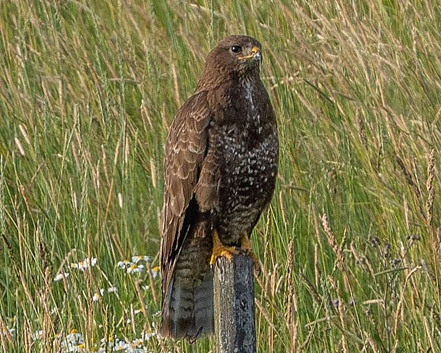 La Buse Variable fait partie de la Faune qui vit dans le Jura, en région Bourgogne-Franche-Comté, en France. La Buse Variable est un rapace diurne, assez commun en France, de la Famille des Accipitridae. La Buse variable est un rapace aux formes massives, doté d'ailes larges, avec une queue courte et large. Son plumage est très variable, d'où son nom. La plupart des individus ont le haut de la poitrine, sombre et très strié, un croissant pâle sur la poitrine, ainsi que des flancs et une culotte sombres. La Buse variable a une espérance de vie de 20ans à 25 ans. De taille plus imposante, la femelle pèse entre 700 g et 1400 g et le mâle entre 550 g et 850 g. Son cri aigu, qui rapelle des miaulements, permet également d'identifier la Buse variable. Ailes larges, une queue relativement courte et arrondie, avec plusieurs barres foncées étroites, et tête ne dépassant que légèrement du bord d'attaque des ailes. Collier clair sur une poitrine souvent foncée et ventre barré ou presque uni. Ses ailes dessinent souvent un V en vol. le bec et les pattes sont jaunes. Bien que ce ne soit pas sa spécialité, la Buse variable sait voler sur place, à l'occasion. Elle bat alors des ailes en se plaçant face au vent, de manière à demeurer statique. La Buse variable est l'un des rapaces diurnes les plus courants en France. Elle mesure 46 cm à 53 cm pour une envergure de 113 cm à 137 cm. La Buse des steppes B. b. vulpinus avance à 52 km/h en moyenne en vol glissé, et atteint régulièrement 45 km/h en vol horizontal battu (Bruderer & Boldt 2001) ; dans une ascendance, elle s'élève en moyenne de 2 m/s (Spaar 1995). Les rongeurs, et les campagnols en particulier, constituent la base de son régime alimentaire. Mais la Buse variable s'intéresse aussi aux verres de terre, aux oiseaux, aux reptiles, aux grenouilles, aux gros insectes et peut devenir charognard si elle trouve un cadavre d'animal.Avec sa vue perçante, la buse est une excellente chasseuse. « Elle mange presqu'exclusivement des micromammifères, comme des campagnols, des rats ou des mulots. De temps en temps, elle complète son régime alimentaire d'insectes, dont les coléoptères ou les vers de terre.