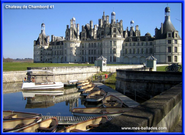 Le Château de Chambord est un chateau bâti à Chambord, dans le Département du Loir-et-Cher, en région Centre-Val-de-Loire, en France. C'est au Roi François 1er que l'on doit la construction du Château de Chambord, qui le fit construire, à Chambord, pour se rapprocher de sa maîtresse : La Comtesse de Thoiry, qui résidait dans la région. Le Château de Chambord se situe dans le département du Loir-et-Cher, en région Centre-Val-de-Loire, en France.