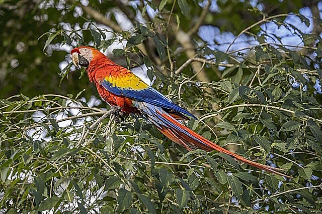 Le Ara Macao appelé aussi le Ara Macao est un grand perroquet coloré, qui vit les forêts tropicales d'Amérique Centrale et du Sud. C'est l'oiseau national du Honduras. Il ressemble à l’Ara chloroptère qui n'a pas de jaune, mais du vert sur ses ailes. L'ara rouge mesure 84 cm à 86 cm de longueur, dont plus de la moitié correspond aux longues rectrices pointues typiques de tous les aras. Il pèse 1 kg en moyenne. Sa durée de vie moyenne est de 80 ans. Son plumage est essentiellement écarlate, mais les plumes de la croupe et du dessus de la queue sont bleu clair, le dessus des ailes est de couleur jaune, les extrémités des plumes de la queue et la partie supérieure de part et d'autre des pennes des ailes sont bleu foncé et le dessous des ailes et les pennes de la queue sont rouge foncé avec des reflets métalliques dorés. Certains individus peuvent avoir du vert sur les ailes près de la bande jaune. L'ara rouge habite dans les forêts humides tropicales américaines, de l'est du Mexique à l'Amazonie péruvienne et brésilienne, dans les terres basses jusqu'à 500 m d'altitude. Les populations d'aras rouges ont fortement diminué en raison de la destruction de leur habitat, des captures pour le commerce et de l'épandage de pesticides pour les cultures. Les plus grands prédateurs des Aras sont les rapaces diurnes. Les mammifères carnivores ne sont que rarement dangereux pour les aras rouges puisqu'ils chassent au sol. Seuls, les Aras rouges évitent les Aras hyacinthes, plus gros, sont de sérieux concurrents, dans leur quête de nourriture.