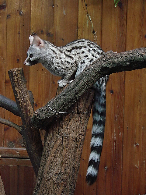 La Genette Commune fait partie de la Faune sauvage qui vit dans les Pyrénées-Atlantiques, en région Nouvelle-Aquitaine, en France. La Genette commune est aussi appelée Genetta genetta ou Genette d'Europe. Ce petit mammifère carnivore, nocturne et discret, de couleur et morphologie qui la font parfois confondre, avec un chat. Elle se répartit, en de nombreuses sous-espèces vivant en Europe, en Afrique et au Proche-Orient. En Europe, c'est la seule espèce représentante de la Famille des Viverridés. Sa longueur du corps : 50 cm à 60 cm. Sa queue fait 41 cm à 52 cm. La longueur du corps + sa queue : 91 cm à 112 cm. Sa Hauteur est de 35 cm. Son poids est de 2 kg. La genette vit et chasse généralement près des points d'eau, des taillis et des forêts denses. Elle est très territoriale et délimite régulièrement son territoire à l'aide de ses glandes périanales et de crottiers. La genette étant un animal essentiellement nocturne, il est difficile de l'observer en milieu naturel. La Genette peut s'apprivoiser, mais sa forte odeur lui a fait préférer, historiquement, le chat. Même si l'animal fut domestiqué par le passé médiéval et fut longtemps une sérieuse concurrente du chat, comme animal domestique, chasseur de rongeurs (aux XVe et XVIe siècles, où le chat fut diabolisé), sa forte odeur musquée le réserve au seul environnement naturel. En France, la Genette a longtemps été chassée pour sa fourrure. Aujourd'hui, elle fait partie des espèces protégées. La Genette commune bénéficie d'une protection totale, sur le territoire français depuis l'arrêté ministériel du 17 avril 1981, relatif aux mammifères protégés sur l'ensemble du territoire français.