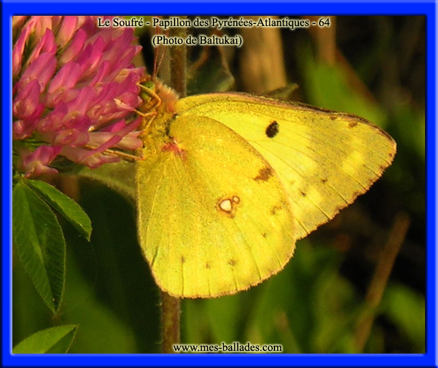Le Soufré est un Papillon qui vit dans les Pyrénées-Atlantiques, et fait partie de la Faune visible, en région Nouvelle-Aquitaine, en France. Le Soufré ou Colias Hyale est une espèce de lépidoptères de la famille des Pieridae, de la sous-famille des Coliadinae et du genre Colias. Sur le verso, le mâle est jaune clair alors que la femelle est blanche et tous deux ont l'apex de l'aile antérieure de forme triangulaire noir taché de clair et un point noir. Le revers est jaune vif chez le mâle. La femelle a l'aile antérieure plus blanche. Au centre de l'aile postérieure apparaît une marque blanche cernée de rosé. Les œufs éclosent vite et donnent des chenilles, à tête verte et au corps vert vif à points noirs aux flancs, ornées d'une raie blanchâtre à traits rouge orangé. La chrysalide est aussi vert vif avec une raie jaune. Le Soufré hiverne sous forme de chenille. Il vole de Mai à Septembre, en 2 ou 3 générations. Les plantes hôtes de la chenille sont des légumineuses, la luzerne et le trèfle. Le Soufré affectionne les prairies fleuries, jusqu'à 2 000 mètres. En France, le Soufré est présent dans de nombreux départements mais les données manquent pour confirmer sa présence en Corse, dans les Côtes-d'Armor, en Mayenne, dans les Pyrénées-Atlantiques, en Ariège, en Aveyron, en Lozère, en Tarn-et-Garonne et en Haute-Garonne.