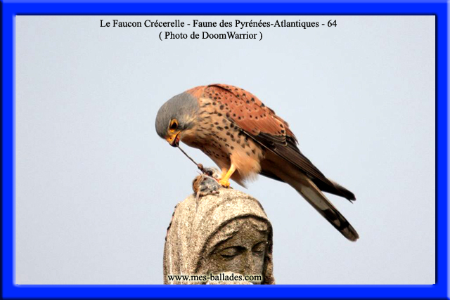Le Faucon-Crécerelle fait partie de la Faune qui vit dans le département des Pyrénées-Atlantiques, en France. Le Faucon Crécerelle est aussi appelé Falco Tinnunculus. C'est un petit oiseau de proie agile, de la Famille des falconidés. C'est l'un des rapaces les plus communs de France avec la Buse variable et le Milan noir. Son petit est appelé le fauconneau. C'est un oiseau diurne. Sa taille est de 31 cm à 38 cm de long pour une envergure de 69 à 82 cm et une masse de 136gr à 300gr pour le mâle et de 170 à 320 gr pour la femelle, qui est plus grande que le mâle. Ses yeux sont noirs. La femelle a la tête et le corps moucheté et une queue rousse avec des raies noires. Le Faucon Crécerelle mâle a la tête et la queue gris ardoise, avec un trait de moustache noire, sous les yeux. Chez les 2 sexes, le bout de la queue est noire. Pour attraper ses proies, le Faucon Crécerelle a 2 méthodes : Il arrive en vol sur un lieu choisi et après une brève montée en altitude, pratique un vol stationnaire dit « Saint-Esprit » face au vent en battant des ailes, à grande vitesse et, en baissant la tête pour observer le sol pendant quelques secondes, puis repart vers un autre lieu, pour renouveler son vol stationnaire. Il peut effectuer ce manège plus de 2 heures. Il peut rester perché, à l'affût sur un arbre, en haut d'un poteau électrique ou sur un poteau de clôture, au bord d'une route. Sa proie repérée, il interrompt son vol stationnaire et fond sur elle, en piqué, dans un vol silencieux, pour l'attraper, par surprise, dans ses serres. Les parades nuptiales ont lieu dès la fin de février jusqu'au mois de mars. Au cours de la parade nuptiale, les Faucons Crécerelles s'adonnent à des poursuites aériennes qui peuvent être très bruyantes. Le mâle courtise sa femelle en lui apportant une proie. La femelle pond, annuellement, 3 à 6 œufs. Ceux-ci sont de couleur blanche à crème, marquée de rouge brique. La nidification a lieu d'avril à août. La durée de l'incubation est de 27 à 29 jours. Les jeunes séjournent de 27 à 32 jours au nid. Puis après leur premier envol, les parents assureront leur apprentissage pendant encore environ 28 semaines. Seule la femelle couve régulièrement. Le mâle ravitaille la femelle. La durée de vie d'un Faucon Crécerelle en bonne santé est de 16 ans.