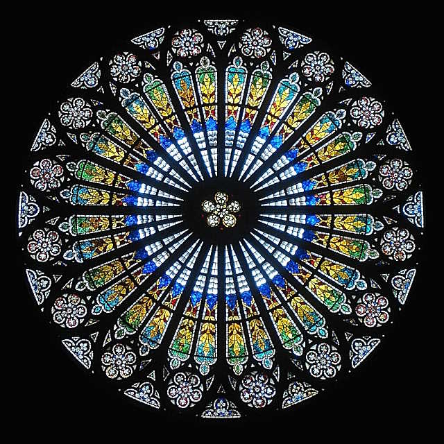 La Rosace vue de l'intérieur. Sa particularité, unique, est composée d’épis de blé, et non de saints, comme c’était la coutume. Ils sont le symbole de la puissance commerciale de la ville. L’intérieur de la Cathédrale Notre-Dame de Strasbourg, typiquement gothique, possède un décor riche et varié, mais elle est plutot sombre comparé aux autres cathédrales françaises, comme Reims ou Chartres. Une seule rose l’éclaire, depuis le mur intérieur, de la façade du parvis. Celle-ci a été dessinée, par Erwin de Steinbach, et comporte 16 pétales. La lisibilité de son dessin en fait un véritable chef-d’œuvre.