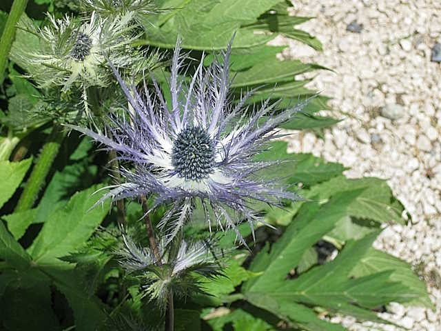 Le Chardon Bleu fait partie de la Flore de la Haute-Savoie, en région Auvergne-Rhône-Alpes, en France. Le Panicaut bleu des Alpes appelé le Chardon bleu des Alpes ou Eryngium alpinum, est une plante herbacée, vivace, de la Famille des Apiacées. Il s'agit d'une plante vivace glabre, haute de 30 à 60 cm, à souche épaisse d'où part une tige dressée feuillée, simple ou un peu rameuse au sommet. Les inflorescences s'épanouissent en juillet et en août. Les fleurs sont petites, blanches, groupées en têtes oblongues (2-4 cm de long) et entourées à leur base d'un involucre de 10 à 20 bractées bleuâtres à bleu violacé, un peu molles et très finement découpées dentées, formant une collerette plus ou moins étalée (3-6 cm de long) ; ces ombelles transformées sont portées par de longs pédoncules également bleuâtres. Les feuilles de la base sont vertes, longuement pétiolées, à limbe ovale triangulaire très en cœur à la base (8-15 cm de long sur 5-13 cm de large) ; les caulinaires, sessiles, sont incisées en plusieurs lobes allongés, toutes sont à bords finement dentés et épineux. Les fruits obovales sont garnis d'écailles obtuses et surmontés par les sépales persistants. C'est une plante rare que l'on peut découvrir dans la Vallée du Fournel (Hautes-Alpes), un lieu unique en son genre. Elle pousse à mi-ombre en petites touffes de plusieurs tiges, dans les bois frais, surtout les hêtraies, de 950 à 2000 mètres d'altitude. Chaque tige porte une fleur, parfois deux, rarement trois.Cette plante affectionne les terrains frais et riches en humus, parfois orientés au Nord. Le Chardon bleu des Alpes pousse exclusivement dans une terre calcaire. En France, le Chardon bleu est protégé au niveau national d'après l'arrêté du 20/01/1982, il est donc "strictement interdit" de ramasser ou d'arracher cette plante à son milieu naturel. On peut trouver des plants ou des fleurs coupées à la vente, par des professionnels, qui peuvent être délivrés, avec un document officiel, indiquant la date, le lieu de la récolte, et le nom du cultivateur, afin de prouver que ces derniers n'ont pas été prélevés dans la nature.