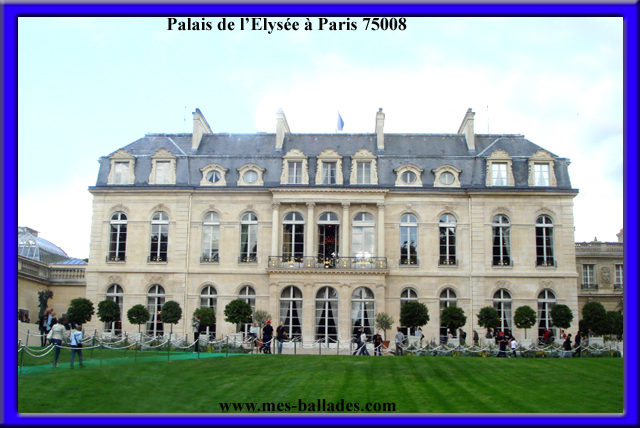 Le Palais de l'Elysée est un Hôtel particulier bâti à Paris, dans le 8ème arrondissement, en région Ile-de-France, en France. Le Palais de l'Élysée est un hôtel particulier parisien, situé au N°55, rue du Faubourg-Saint-Honoré à Paris. Construit par l'architecte Armand-Claude Mollet en 1720 pour Louis Henri de La Tour d'Auvergne, comte d'Évreux, le palais de l'Élysée a une histoire illustre : cadeau du roi Louis XV à sa favorite, la marquise de Pompadour, en 1753, puis palais princier de Joachim Murat, beau-frère de Napoléon Ier, qui, en 1805, en fit sa résidence impériale. Son neveu, Napoléon III, y habita également. L'actuel hôte de l'Élysée est François Hollande, président de la République française depuis le 15 mai 2012. Il s'agit du siège de la présidence de la République française et la résidence officielle du Président de la République, depuis la IIe République. Comme chaque année, au moment des 2 Journées du Patrimoine, les portes du Palais de l'Elysée sont ouvertes au Public.
