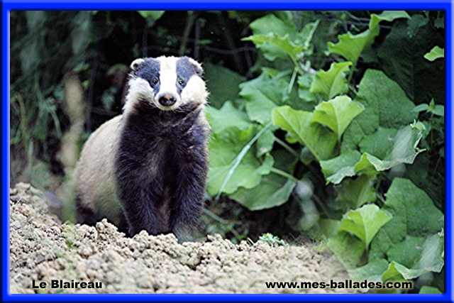 Le Blaireau Européen fait partie de la Faune qui vit dans le département des Vosges, en France. C'est un carnivore, de taille moyenne, peu connu. Le Blaireau Européen appartient à la Famille des Mustelidae. Ce mustélidé omnivore héberge, dans son terrier, de nombreux hôtes. Il possède une taille moyenne, un corps massif, avec de courtes pattes et un museau allongé. Sa fourrure, épaisse et rude, est bicolore, noire ou grise-brune, avec le plus souvent de larges bandes blanches qui démarrent de la tête et se prolongent sur le cou ou le dos. Trapu et court sur patte, il peut atteindre 70 cm de long (90 cm avec la queue, qui mesure 20 cm environ), pour 25cm à 30 cm au garrot et pèse de 12 à 20 kg maximum. C'est un animal fouisseur, capable de construire de vastes galeries familiales profondes de 4 à 5 mètres sous terre et longues de 15m de long. Il aime se déplacer la nuit et peut parcourir 10 km. En moyenne, la taille de son territoire couvre 40 à 50 hectares. Sa nourriture est variée : molusques, insectes,larves, bourdons, sauterelles, rongeurs, campagnols, taupes,lapereaux, oeufs, oisillons, petits rongeurs,grenouilles, crapauds. En hiver,il peut manger jusqu'à 100kg de lombrics ! Le Blaireau, étant immunisé contre le venin du serpent, en fait son repas aussi. Mais il apprécie aussi les végétaux, les fruits, les glands , les racines et tubercules dont il est très friand. Le blaireau enrichit également certains sols en nutriments : Il marque son territoire par des placettes où il urine, ce qui est une source constamment renouvelée d'azote pour le sol, appréciée par le sureau. Ses terriers abandonnés peuvent devenir des refuges provisoires pour d'autres espèces. Le Blaireau tolère également souvent la présence du Renard roux ou du Lapin de garenne dans son terrier. Le Putois, la Fouine, la Belette ou le Chat sauvage exploitent également ce gîte. Les Mulots et les Campagnol peuvent y entrer et ajouter leurs propres galeries latérales, dans les tunnels du terrier. Le Blaireau a peu de petits (0,3 par an). Ce sont les Blaireaux Européens, les plus agés, qui quittent le nid, laissant la place, aux plus jeunes.