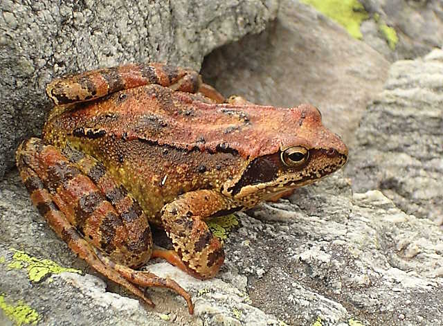 La Grenouille rousse fait partie de la faune de l'Indre-et-Loire, en région Centre, en France. La grenouille rousse est un petit amphibien de la Famille des Ranidés. La grenouille rousse possède un corps trapu, de gros yeux, des pattes avant plus petites, des pattes arrières puisantes avec de longs doigs. La Grenouille rousse, Rana temporaria, est une espèce d'amphibiens de la Famille des Ranidae1. Certains considèrent Rana honnorati comme une espèce distincte de Rana temporaria. Comme tous les amphibiens, l'espèce est en régression, depuis 10 ans et a disparu d'une partie de son aire naturelle de répartition. Rana temporaria mesure de 50 mm à 65 mm en plaine, et à haute altitude de 70 à 80 mm, chez le mâle et 75 à 85 mm chez la femelle (au maximum 100 mm). La femelle est bien plus grosse que le mâle. Son corps est trapu, le museau fortement arrondi chez les vieux spécimens (à la différence de la grenouille agile qui a le museau plutôt pointu), un œil doré à la pupille horizontale, un tympan en général bien visible, de la même taille ou plus petit que l’œil, inclus dans une longue tache temporale sombre se prolongeant au-delà de l’œil jusqu'à la narine. Elle possède deux lignes bien marquées sur le dos, formées par des replis latéraux-dorsaux qui de manière caractéristique se rapprochent au milieu du dos. Le mâle possède un sac vocal interne qui produit parfois sur la gorge un reflet bleuâtre. Les mâles reproducteurs ont un aspect flasque, une gorge blanc pur ou bleutée, une teinte générale grisâtre et sont dotés de bras robustes. Ils portent des callosités nuptiales marron foncé ou noires sur les pouces.Les femelles sont pus dodues, plus claires que les mâles et sans callosités foncées aux pouces. A la saison de la reproduction, elles présentent des granules perlés sur leurs flancs et leurs jambes. Elle se nourrit de petits insectes ou crustacés, d'arachnides, de mollusques (limaces), de vers de terre et de larves d'amphibiens. Elle capture ses proies en lançant sa langue gluante sur eux. Une étude a comparé son contenu stomacal avec celui du lézard. A la fin de l'hibernation, en Janvier à Février (plus tard en montagnes), les grenouilles rousses migrent en masse, la nuit, vers leur site de reproduction. Elles peuvent parcourir 1 voire 2 kilomètres. L'accouplement et la ponte se déroulent sur une période pouvant aller de 15 jours à beaucoup plus dans les régions méridionales, entre janvier-février et avril, selon l'avancement de la végétation et l'altitude. La gorge de la grenouille rousse mâle devient blanche et celle de la femelle, devient rouge. Les oeufs sont noirs. La durée de vie de la Grenouille rousse est de 6 ans à 10 ans.