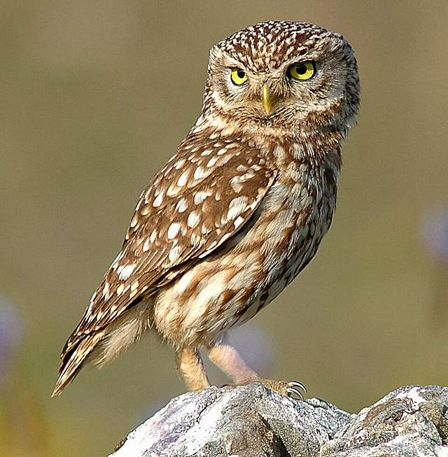 La Chouette Chevêche ou Athene nocturne est un oiseau de la Famille des Strigidae, de petite taille, à l'aspect trapu. C'est le plus diurne des strigidés. La Chouette Chevêche est de petite taille, plus petite qu'un pigeon. Elle mensure 26 cm. Elle est aussi ronde et trapue et pèse de 180 g à 200 g. Elle possède une tête aplatie, avec un front bas. Ses yeux jaunes, sont entourés de noir, sous des sourcils blancs et froncés, lui donnant un air sévère. Le crâne est piqueté de petites taches blanches. Son bec est jaune-verdâtre. Sur le dessus du corps, le plumage est grisâtre, semé de taches plus claires. Le poitrail est blanchâtre avec des rayures brunes. Sa queue est courte. Ses pattes, beige-clair, sont couvertes de petites plumes blanches. Les déhanchements de sa tête sont caractéristiques, de même que son vol ondoyant. Son cri clair et bref, est une sorte de « kiou kiou » ou « kiwitt ». Les deux sexes sont identiques et les jeunes sont plus pâles que les adultes. Son envergure varie entre 50 cm et 56 cm.