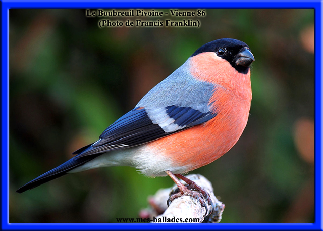 Le Bouvreuil est un petit oiseau sauvage, qui fait partie de la Faune de la Vienne, en région Nouvelle-Aquitaine, en France. Il vit et se nourrit en couple, à la lisière d'un bois ou d'une haie. Il disparaît rapidement si on l'approche. Il appartient à la Famille des Fringillidae. Devenu un visiteur régulier des petits jardins, dans les régions riches en vergers, il reste très discret, à l'abri de la végétation. On compte 7 espèces de Bouvreuils, dont, le Bouvreuil des Açores, est en danger critique d'extinction, selon l'UICN. Cette dernière espèce vit aux Açores, tandis que les 6 autres se trouvent, en Eurasie. Ce sont de petits passereaux appartenant à la Famille des Fringillidae et à la sous-Famille des Carduelinae. Sa livrée élégante lui vaut d'être l'un des passereaux les plus populaires et il est souvent représenté sur les cartes de vœux de la nouvelle année, sur fond de paysage enneigé. Le plumage de son dos est gris, les ailes et la queue sont noires ainsi que le dessus de la tête. Le croupion est blanc. Le mâle se distingue par ses joues, sa poitrine et son ventre rouge rosé. La femelle arbore une poitrine plus terne, gris-orangé ou beige. Les Bouvreuils « petit bœuf » à cause de leur corps trapu ou « petit bouvier » suivent souvent les laboureurs qui conduisent la charrue. Ils forment le genre Pyrrhula (du grec pyrrhos, « couleur de feu », en référence à la couleur flamme de leur plastron. Les Bouvreuils pivoines en liberté ont une durée de vie maximale de 6 à 8 ans. Cependant, l'espérance de vie moyenne n'est que de 3 ans. En captivité, ils peuvent vivre jusqu'à 17 ans. L'Épervier d'Europe est le principal prédateur du Bouvreuil pivoine. Les œufs et les oisillons sont, eux, convoités par le Geai des chênes, la Corneille noire, la belette, l'hermine et de petits rongeurs.