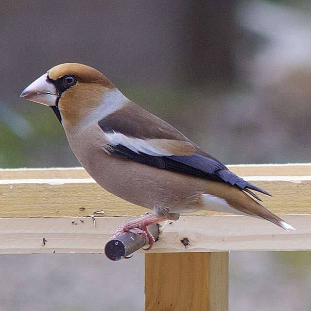 Le Gros-Bec Casse-noyaux fait partie de la Faune qui vit dans la Vienne, en région Nouvelle-Aquitaine, en France. C'est un oiseau sauvage. Le Gros-Bec Casse-Noyaux est un passereau, de la Famille des Fringillidae. Il est partiellement migrateur. C'est l'espèce la plus grande des Fringillidae et la seule du genre Coccothraustes. Il est apparenté à certains gros-becs, classés depuis dans des genres différents. Le Gros-Bec juvénile a la tête brun jaune, peu marquée, la poitrine et les flancs sont tachetés et la barre alaire, est séparée en deux. Le gros-bec est très farouche, méfiant et assez erratique, il ne se laisse pas approcher facilement, et il s'enfuit pour se percher en haut des arbres et ne redescend, que très craintivement, de branche en branche. Son vol est puissant et onduleux, sa démarche sautillante est tanguée. Lorsqu'un gros-bec mâle a réussi à séduire une femelle, il commence sa parade nuptiale. Le mâle hérisse ses plumes et agite ses ailes et sa queue. Ensuite, sa partenaire s'avance vers lui et il commence à faire des révérences. La parade se termine par un « baiser » entre les deux partenaires, ils collent leurs deux becs. A ce stade, le mâle va chercher de la nourriture, qu'il dépose, directement, dans le bec de la femelle. Pendant le vol nuptial, les Gros-Becs Casse-Noyaux se poursuivent en poussant de grands cris. Duant cette période, le gros-bec est très nerveux et agressif. Le Gros-Bec Casse-noyaux est un oiseau migrateur. Il migre en Hiver, se regroupant souvent avec ses congénères de la même espèce.