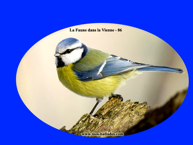 La Mésange Bleue est un petit oiseau qui vit dans le département de la Vienne, en région Nouvelle-Aquitaine, en France. La Mésange Bleu est un passereau, de la Famille des Paridés. Cette Mésange Bleue est identifiable grâce à sa petite taille, ses pattes fines, son bec fin et son plumage à dominante de bleu-cobalt sur la calotte, les ailes et le dessus de la queue, avec un poitrail jaune et le ventre. Elle occupe les habitats pourvus de nombreux arbres et de verdure où elle trouve sa nourriture. Les forêts de feuillus et les bocages sont ses milieux de prédilection mais elle fréquente aussi les parcs et les jardins. C'est une espèce européenne, partage son habitat avec d'autres espèces de mésanges (comme la Mésange Charbonnière) qui montrent des différences dans la distribution spatiale et dans la niche écologique exploitée. Cet oiseau est insectivore et sédentaire, il est familier aux hommes et fait preuve d'une certaine tendance anthropophile qui s'adapte volontiers aux jardins des localités habitées, même dans les grandes villes. Plus petite que la Mésange Charbonnière, la Mésange bleue adulte a une taille de 10 cm à 12 cm, pour un poids moyen de 9 à 14 g. Elle se caractérise par la couleur bleu cobalt de sa calotte, comme celle de ses ailes et le dessus de sa queue. En situation d'alerte, elle érige occasionnellement sa calotte en huppe dressée. La Mésange bleue est réputée, pour chasser de manière acrobatique, dans la végétation, suspendue aux branches, la tête en bas, avec agilité pour surprendre ses proies, sous les feuilles et rameaux. Lorsqu'elle en a terminé avec une brindille, elle s'installe sur la suivante, avec des mouvements de balancier caractéristiques. C'est une visiteuse habituelle des mangeoires en hiver, se suspendant volontiers aux boules de suif. Il s'établit au niveau des mangeoires une hiérarchie de dominance : les troupes de plusieurs individus qui viennent aux mangeoires comprennent généralement un couple dominant, des jeunes de l'année et quelques adultes célibataires. On dit que la Mésange titine, zinzinule ou zinzibule.