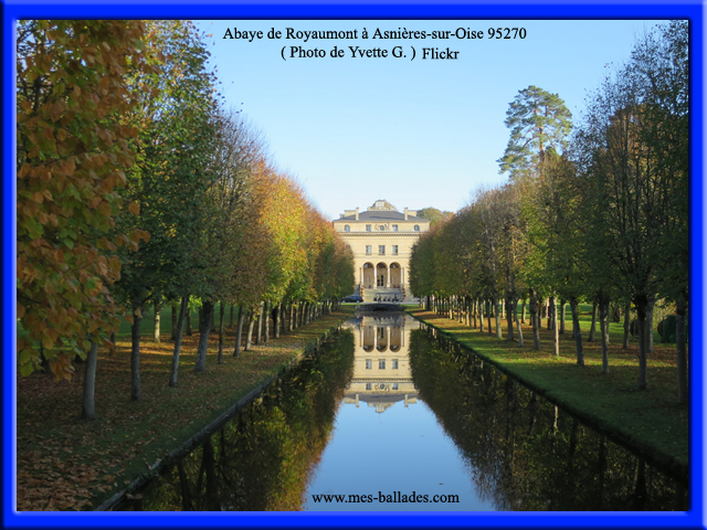L'Abbaye de Royaumont se situe dans le Département du Val-d'Oise, à l'écart du village d'Asnières-sur-Oise (95270). L'Abbaye de Royaumont est entourée de ruisseaux, d'étangs et d'une réserve naturelle ornithologique. Les matérieux utilisés pour reconstruire l'Abbaye de Royaumont sont la pierre, la tuile et le calcaire.