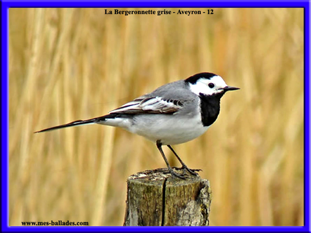 La Bergeronnette grise appelée Motacilla alba, fait partie de la Faune qui vit dans l'Aveyron, en région Midi-Pyrénées, en France. Ce petit oiseau appartient à la Famille des Motacillidés et à l'ordre des Passériformes. Sa taille fait 17 à 18 cm. Son poids varie de 20g à 23 grammes. Ses ailes ont une envergure de 21 à 28 cm. La Bergeronnette grise bénéficie d'une protection totale sur le territoire français depuis l'arrêté ministériel du 17 avril 1981 relatif aux oiseaux protégés sur l'ensemble du territoire. Elle peut vivre 10 ans. Elle a une calotte noire, un masque blanc et un ventre blanc. Sa queue est longue.