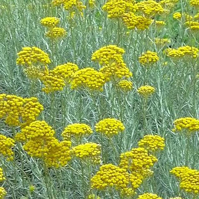 L'Immortelle de Corse est une fleur endémique qui pousse sur l'île de beauté. Elle se trouve aussi très présente dans le Bassin Méditerranéen. Elle est aussi appelée la Plante à Curry. L'Immortelle de Corse est une plante vivace appartenant à la Famille des Astéracées. Elle pousse principalement sur les sols arides et ensoleillés de la région méditerranéenne, plus particulièrement en Corse. En Corse, l'Immortelle est une fleur emblématique, reconnue depuis l'Antiquité, pour ses vertus cicatrisantes, apaisantes et antiseptiques ainsi que pour la circulation sanguine qu'elle améliore. Sa couleur est or. On l'utilise dans le domaine de la Cosmétique, en crème, en huiles essentielles, en hydrolats ainsi qu'en senteurs d'ambiance en bougies, en sprays et en mikados. La légende dit que l'Immortelle ne fane jamais, même après avoir été cueillie. L'Immortelle possède des bienfaits peu connus : C'est un traitement Naturel des Hématomes, elle améliore la Circulation Sanguine, elle soulage des douleurs rhumatismales et l'Arthrite, elle réduit le taux de Cholestéro, elle accélère la cicatrisation, elle calme la couperose et les rougeurs. De juin à août, elle produit des inflorescences jaune vif en capitules arrondis, apportant une touche lumineuse et chaleureuse au jardin. Elle forme un buisson compact d'environ 40 à 60 cm de hauteur, et autant de largeur. L'immortelle augmente la production de collagène, qui permet à la peau de rester ferme.